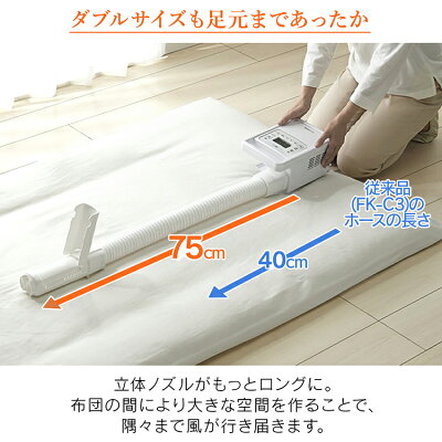 2.ロングホース&立体ノズルで、ダブルサイズも隅々まであったか ホースが長くなったことにより、さらに遠くの足元までの暖めが可能に。