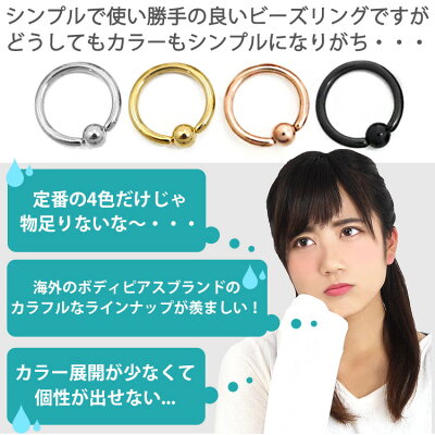 Item Info POPにきめるなら全18色のカラフルビーズリング ボディピアスの定番商品「ビーズリング」が驚きの全18色のカラーバリエーションに。